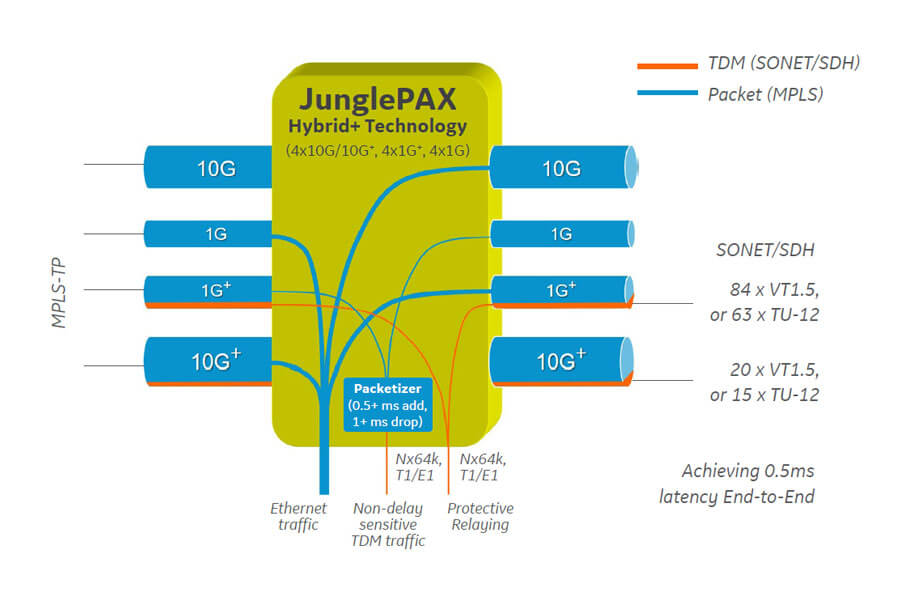 La tecnología JunglePAX Hybrid + ofrece lo mejor de ambos mundos al preservar el rendimiento de SONET/SDH en una red de conmutación de paquetes. Esto se logra agregando una capa SONET/SDH independiente junto con la capa MPLS-TP (sin afectar su capacidad) sobre el mismo enlace WAN óptico. El uso de esta capa es opcional y está diseñado para aplicaciones de retransmisión basadas en TDM (C37.94, RS-232 Mirrored Bit, G.703 64k, etc.) que son extremadamente sensibles a los retrasos.